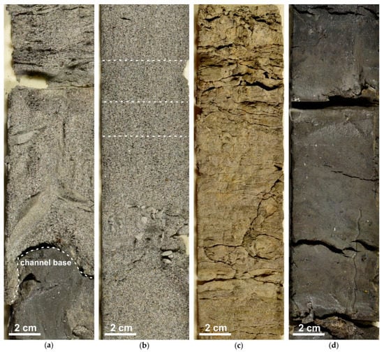 Cored deposits: (a) massive medium sand with pebble-sized mudclasts forming the channel lag; (b) fine to medium sands from the lower point bar; (c) fine to very fine sands, with cross lamination and mud layers from the upper point bar; and (d) massive overbank mud with moderate organic content and horizontal bedding.