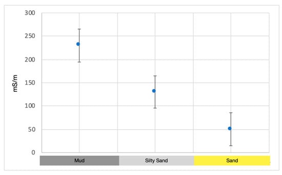 Fourth, geophysical inversion is an inherently ill-posed problem. In this case, it means that while the general pattern of the electrical conductivity variation with depth is constrained by the data, the subtler details may not be retrieved uniquely. In other words, at each measurement location, a number of different 1D models, which all, however, maintain certain key patterns, can be equivalent in terms of goodness of fit to the measured data within the data uncertainty range. In particular, for example, if conductivity increases with depth, all inverted profiles will display the same general pattern. However, the transition from lower to higher conductivity may happen continuously, or in steps, and steps may occur at slightly different depths. While this can be viewed as a weakness of geophysical methods (and EMI in this particular case), it is not without remedy. Indeed, geophysics should never be applied without some “ground-truth” coming (as in this case) from drilling investigations (local and not without their uncertainties, but still necessary). Thus, an iterative revision of the inverted vertical profiles was conducted to select, among the plausible electrical conductivity profiles those that also fit reasonably to the direct evidence where this evidence is available. The procedure was simply performed manually, particularly selecting suitable layer interfaces compatible with drilling evidence. This type of procedure should always be applied, and it is in the energy exploration where 3D seismic data are blended, e.g., with well logs coming from deep borings. For the geophysical data used in this study, the “ground-truth” is given by the local comparison between lithology from sedimentary cores (AV_1, AV_a, AV_b and AV_c) and electrical conductivity derived from EMI inversion at the same locations. A plot showing the resulting correlation, also taking into account the variability of electrical conductivity for the same lithology (shown as standard deviation error bars) is shown in Figure 9.