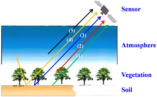 Radiation components received by a passive microwave (PMW) sensor at the top of the atmosphere (TOA): (1) soil-emitted radiation attenuated by the vegetation and the atmosphere; (2) vegetation upwelling radiation attenuated by the atmosphere; (3) vegetation downwelling radiation reflected by the surface and attenuated by the vegetation and the atmosphere; (4) atmospheric downwelling radiation and cosmic background radiation attenuated by the vegetation, reflected by the surface, and attenuated by the atmosphere; and (5) atmospheric upwelling radiation.
