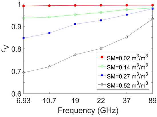 Vertically polarized emissivities versus different frequencies for four surface soil moistures (SM).