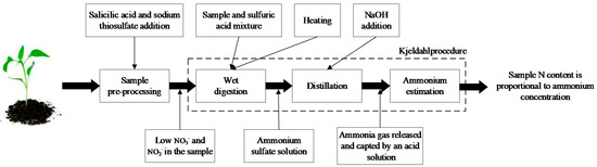Many crop N diagnosis methods have been developed (Table 1), which can be categorized as traditional methods (destructive diagnosis) and non-destructive methods (reflectance-based, transmittance-based, and machine vision methods) [9]. Among them, traditional methods such as Kjeldahl-digestion (shown in Figure 1) need to collect a large number of samples in advance and carry out pre-processing, wet digestion, distillation, ammonium estimation steps to determine the N status of crops [10]. However, these methods are time-consuming and have high cost, thereby limiting their use [11,12]. There are many other examples such as leaf color chart and soil and plant analyzer development (SPAD) proposed for rapid and non-destructive estimation of crop N status in situ [13,14]. However, these methods mainly focus on the individual leaves [15]. Hence, developing real-time and non-destructive methods for crop N status diagnosis at large scales is particularly important.
