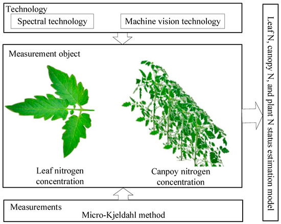 Spectral and machine vision technology have become the main choices for crop N status diagnosis. As an optical sensor, it enables rapid and periodic assessment of crop N status [36]. As shown in Figure 2, for the spectral technology, we can use it to obtain the spectral information of crop leaves and canopy, respectively, and then use the data pre-processing method to obtain the characteristic bands. For machine vision technology, we can use it to obtain the image information of crop leaves and canopy, and then obtain the feature information through image segmentation and feature extraction. Among them, the spectral information or image information of canopy can not only reflect the N status of crop canopy, but also reflect the N status of the whole plant. Then the destructive methods (such as the Kjeldahl method) are used to obtain the actual N status of the crop. Based on the correlation analysis between spectral feature band or image feature information and crop actual N status, the estimation model of crop leaf, canopy, and whole plant N status are established. However, the quality of the N status estimation model is often affected by the external environment factors, such as external light, soil background, etc.