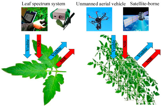 Spectral reflectance is a promising and convenient index for continuous sampling and narrow wave selection, which can sensitively reflect the specific physiological variables of crops [37,38]. Within the range of 350–1300 nm, the accurate measurement of leaf spectral reflectance depends on the interaction between light and crops and its influence on the spectral characteristics of green leaves, which enable accurate quantification of the crop N status [39]. Among them, we usually use hand-held or near ground spectral sensors to collect the crop leaf spectral information and unmanned aerial vehicle (UAV) or remote sensing technology to collect the spectral information of large-scale crops canopy in the visible and near-infrared spectral band range (Figure 3). Then, the data pre-processing method is used to select the characteristic band, and the appropriate estimation method is selected to construct the N status estimation model.