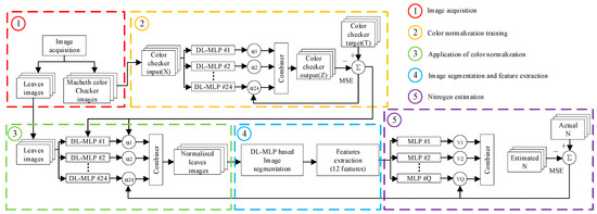 It is a critical task to select an appropriate estimation method for establishing a robust estimation model, which can assess crop N status. Compared with the statistical method, ANN has good potential to process data. In particular, when the image feature is multifarious, and the original data do not follow a similar distribution pattern [150,151,152]. For example, based on R, G, B channels of the color image obtained from a digital camera, a linear regression model and ANNs model named the multilayer perception neural network (MLPNN) was established and the result showed that the MLPNN model has better accuracy than the linear regression model [153]. As a popular algorithm, PLSR was used when processing multivariable data, and many studies have demonstrated that this method is powerful for acquiring key variables and establishing an accurate regression model [154,155], which is effective in estimating water and N status of winter wheat [145]. Moreover, combinations of algorithms are also common. The random forest (RF) was used as the estimator for crop N status and biomass estimation, and simple linear regression (SLR) was used for validating the consistency of the results of RF [132]. However, when there is a large amount of data, the above methods have some limitations in calculation efficiency and model accuracy. In this case, it is difficult to ensure the accuracy and real-time of crop N status assessment. With the development of deep learning in image processing, an ensemble of deep learning multilayer perceptron was proposed by using committee machines, which can be used for color normalization and image segmentation, and combine with a genetic algorithm (an optimization algorithm) to fine-tune the color normalization and achieve a good result in crop N estimation [156]. Among them, the principle of image processing and N status evaluation of this method is shown in Figure 5. Compared with linear regression, non-linear regression, and neural network, the deep learning method has higher training accuracy, but it requires a lot of data. When the amount of data is small, it is likely that the training results have been fitted. Therefore, in the later process of algorithm selection, we should choose whether to use a deep learning method according to the size of the data.