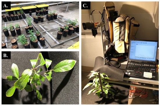 Experimental and data collection set up. Willows were grown in a greenhouse setting (A) and canopy spectra were collected using an FieldSpec Pro Full Range Spectroradiometer (C). A spectrally flat black-foam material below the canopy to avoid introducing soil and background noise (B).