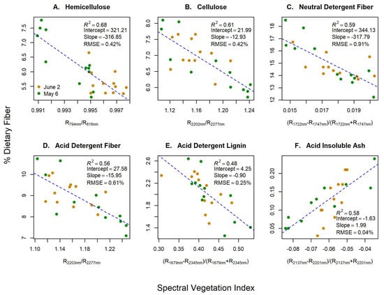 Spectral vegetation indices (SVIs) from hyperspectral data for green dietary fibers concentrations (Y-axis) of (A) hemicellulose, (B) cellulose, (C) neutral detergent fiber, (D) acid detergent fiber, (E) acid detergent lignin, and (F) acid insoluble ash. X-axis labels represent the measured reflectance (R) at given wavelengths in nanometers of SVIs.