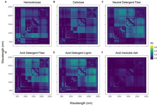 Coefficients of determination (R2) between green dietary fibers, (A) hemicellulose (HMC), (B) cellulose (CLL), (C) neutral detergent fiber (NDF), (D) acid detergent fiber (ADF), (E) acid detergent lignin (ADL), and (F) acid insoluble ash (AIA) and spectral vegetation indices (SVIs) generated from hyperspectral data. The x- and y-axes are the wavelength (nm) from the spectrometer. The best performing SVIs were for HMC, for CLL, ( for NDF, for ADF, ( for ADL, and ( for AIA—where R represents the measured reflectance at given wavelengths in nanometers.