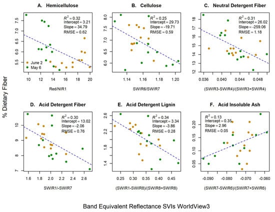 Band equivalent reflectance of WorldView-3 (WV-3) spectral vegetation indices (SVIs) for green dietary fibers concentrations (Y-axis) of (A) hemicellulose, (B) cellulose, (C) neutral detergent fiber, (D) acid detergent fiber, (E) acid detergent lignin, and (F) acid insoluble ash. X-axis labels represent the WV-3 bands used to create the best performing SVIs, and contain red, near infrared-1 (NIR1), and shortwave infrared (SWIR) bands.