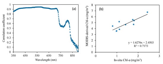 The chlorophyll concentration measured before the passage of typhoon Muifa on 8 August 2011, revealed the chlorophyll concentration measured in situ has a good correlation with the measured remote sensing reflectivity at 350–720 nm (Figure 2a). However, the comparison with MODIS inversion results on 13 August 2011 shows that MODIS overestimated the chlorophyll concentration value, which may be caused by the asynchronization of measurement and image time (Figure 2b). Therefore, the chlorophyll concentration data in this study were mainly obtained by using the inversion model constructed by measured data.