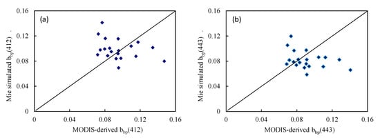 A comparison of the backscattering coefficients estimated by Mie scattering theory and those retrieved by the MODIS images (Figure 3) revealed that the wavelengths 412, 443, 645, 745, and 858 nm were not sensitive to changes in the Mie scattering refractive index. By contrast, in several other sensitive bands, the range over which the backscattering coefficients estimated by Mie scattering varied was smaller than that estimated by the MODIS inversion. The values and ranges of the backscattering coefficients of the suspended particulate matter measured in this region [42] indicated that the estimated backscattering coefficients based on Mie scattering and the QAA algorithm were closer to the measured results. The two algorithms did deviate from the measured results; however, possibly due to atmospheric correction errors in the MODIS remote sensing reflectance product, the selection of empirical parameters in the QAA algorithm, and a lack of synchronization over the field-measured data.