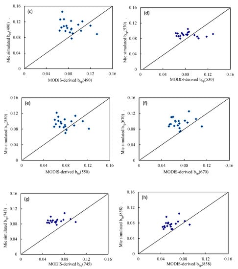 The distribution function describing the volume percentages of suspended particulate matter obtained from on-site sampling and the backscattering efficiencies estimated by Mie scattering theory were used to estimate the backscattering coefficients of the suspended particulate matter using Equation (9). The input parameters provided in QAA V5 and Section 3.1 were used to estimate the backscattering coefficients of the suspended particulate matter over the wavelength range 412–865 nm in the MODIS satellite images. An example of a MODIS image taken on 21 November 2004 is presented herein. The estimation results, which did not consider absorption, indicated that the backscattering efficiency factor in this region oscillated with increasing particle diameter. For a fixed particle size, the backscattering efficiency factor decreased with increasing complex refractive index. Once the absorption was considered, however, the backscattering efficiency factor increased with the number of particles, and the particle diameters in this region were concentrated at about 30 µm.