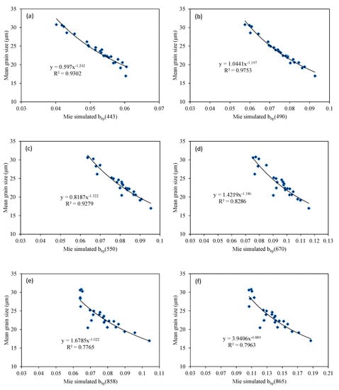 The backscattering efficiency and backscattering coefficient estimated by the Mie scattering and QAA algorithms in the previous section were next verified. The parameters describing the suspended particles, including the average particle size, sorting, skewness, and kurtosis, were calculated using the LSQR solution equation using the backscattering coefficient retrieval from the MODIS images and the backscattering efficiency factor estimated by Mie scattering. During the calculation process, the MODIS images were selected from 12 wavebands ranging from 412 nm to 868 nm, and the wavebands were selected mainly based on the light scattering characteristics of the visible and near-infrared wavebands in coastal waters in previous studies [28,73]. The results showed that the average particle size of suspended particles was correlated with the simulated backscattering coefficient (Figure 4). In this paper, the power exponential relationship between the average particle size and backscattering was assumed, and the dependence of backscattering on the wavelength was better in the visible light band than in the near-infrared band.