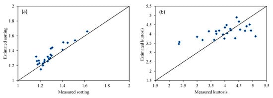 The validated calculated sorting and kurtosis particle size parameters agreed well with the measured results (Figure 7). The MODIS band settings, therefore, can be used as input parameters to estimate the sorting and kurtosis particle size parameters.