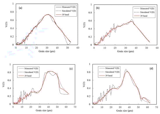 Comparison of the simulated typical particle size percentage distribution curves over the study area with the measurement results. The simulated V (D) was 18 wavebands. (a–d) denote the four types of particle size distribution curves measured from 13 to 21 November 2004 in Heini Bay.