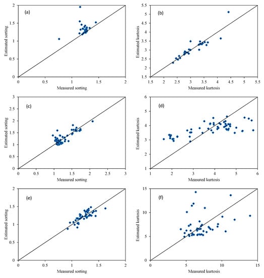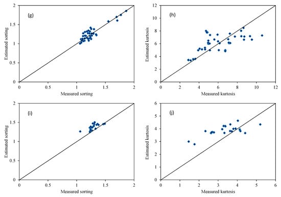Comparison of the measured sorting and kurtosis values of the suspended particles with the estimated values from 19–27 June 2004 (a,b) and September 2012 (c,d) in the Yellow River estuary; in May (e,f) and September 2018 (g,h) in the Bohai Sea; and in the South Yellow Sea from 19 March to 23 April 2003 (i,j).