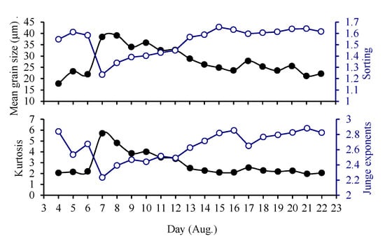 Variations in the average particle size, sorting, kurtosis and Junge-type power law slope obtained from the sediment trap sample during the passage of typhoon Muifa on 8 August 2011.