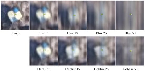 Early deblurring methods required the knowledge of the k(M) function, which means they can be classified as non-blind deconvolution methods. In order to perform deconvolution and obtain an image , they were primarily based on Lucy–Richardson algorithms [69] and Wiener [70] or Tikhonov [71]. In the case of images obtained by commercial UAVs, we assume that the blur function is unknown. As already mentioned, inexpensive non-metric cameras are not fitted with any technical devices for blur kernel estimation. In such a case, it can be assumed that the application blind deblurring methods, which estimate the blur kernel k(M) can lead to obtaining a latent image . Unfortunately, these methods are intended for images with uniform blur, generated as a result of uniform camera motion relative to the object or background [72,73,74,75]. In the case of UAV images, assuming that the k(M) function is the same for the entire image surface is a great simplification and can lead to erroneous results. Some authors have identified this issue and are working on numerical methods based on a non-uniform blur model. The publications [76,77] present a non-uniform blind deblurring model based on a parametric geometric model of the blur process, which additionally takes camera rotation into account. The paper [78] assumes that blur is induced by a complex spatial motion of the camera. Therefore, it can be assumed that the estimation of the k(M) function for UAV images, taking into account all possible flight plans and cases is a very difficult task.