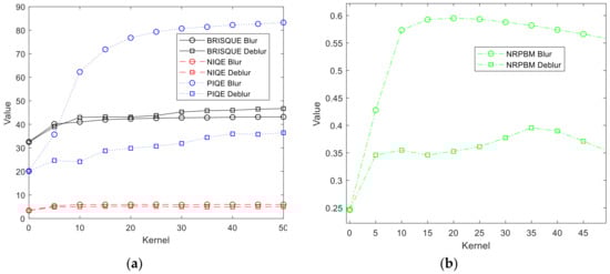 Image quality evaluator score changes: (a) blind referenceless image spatial quality evaluator (BRISQUE), natural image quality evaluator (NIQE) and perception-based image quality evaluator (PIQE); (b) no-reference perceptual blur metric (NRPBM).