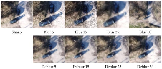 The methods for eliminating blur formed on aviation images assume that blur is of a linear nature, which is the case most often. This assumption is also adopted by FMC systems. When obtaining data using a UAV, the flight can be performed according to highly varied plans, at varying altitudes and distances to the object, and in different lighting conditions [66]. For this reason, the nature of blur can be non-uniform, which makes it hard to forecast [67,68]. Due to the above, the author of this publication concluded that the neural methods developed in recent years were able to eliminate blur on UAV images with an unpredictable or highly variable blur nature.