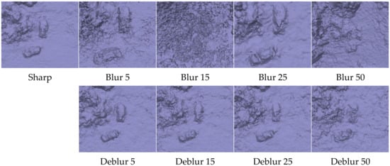All sets with applied blur were individually subjected to the deblurring process. For this purpose, images with blur were successively provided as input data for a trained generative adversarial network model. The resulting images for each set were used to generate ten further sets of photogrammetric products. This process was similar to the one involving reference models, with the same processing software settings being used. Figure 4 shows a visual comparison of the results for the DebluGANv2 algorithm for GCP No. 1. The images show, respectively, a reference photo (sharp), photos with blur for kernel 5, 15, 25 and 50, and the corresponding images with blur reduction.