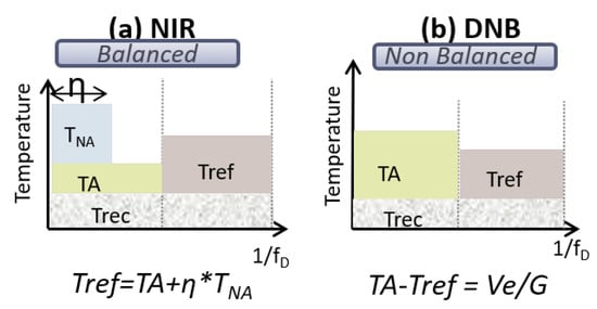 When the antenna temperature is lower than the reference temperature (TA and Tref, respectively, in Figure 1), the noise injection process consists in adding noise (noise equivalent temperature called TNA) to the antenna path in order to balance the reference temperature and the antenna temperature. The amount of noise injected in the antenna path is determined by the noise injection pulse length ().