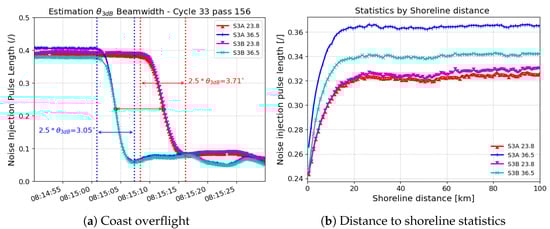 Pixel size and pointing have been checked with different analyses. Figure 3a shows the noise injection pulse length (raw counts) for a land/sea transition during the tandem phase, at MWR sampling rate of 150 ms. With the 36.5 GHz channel looking forward, it indicates the transition before the 23.8 GHz channel. The brightness temperature will be contaminated by land in the main beam, defined as 2.5*. The beginning and end of the contamination (dotted vertical lines) provide estimations of the aperture of and for 23.8 GHz and 36.5 GHz channel respectively, which are very close to the ground measurements (Table 1). Considering the altitude of the satellite, footprints are estimated to 20.9 km and 17.8 km. Moreover, the inflection point represents the time when the maximum gain has crossed the shoreline. The spanning between the inflection points of the two channels will provide an estimation of the total mispointing, estimated to for this example, very close to the on-ground measurements ( for S3A and for S3B, Table 1). Figure 3b shows statistics of the noise injection pulse length over one cycle of the tandem phase. In this figure, data are averaged by 1 km bins of distance from shoreline, up to 100 km. One can note the very good consistency of both instruments with respect to the land contamination.