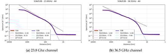Radiometer sensitivity was computed in diverse ways and compared to ground measurements performed before launch. One of the methods consists in performing a spectral analysis of the brightness temperatures. The use of MWR measurements directly at MWR sampling rate, i.e., before averaging to the altimeter time tag, gives access to the MWR instrumental noise, called the radiometric sensitivity. Figure 4 shows the ocean data spectra for each channel of both instruments. S3A/S3B spectra of 23.8 GHz brightness temperatures are similar with a law for scales between 50 km and 250 km, consistent with figures provided for wet troposphere correction [16]. In distances between 33 km to 25 km, the spectra follow a law. The cutoff frequency with the noise plateau represents half the size of the MWR pixel. The MWR pixels radius are then found to be 23.4 km/16.3 km, consistent with the on-ground measurements and the estimation exploiting the land/sea transition. Below that cutoff frequency, the spectra are flat, revealing nothing but white noise. The only information available at these scales is the instrumental noise. This noise provides an estimation of the MWR sensitivity of 0.29 K/0.31 K for 23.8 GHz channel of S3A/S3B respectively; of 0.31 K/0.32 K for 36.5 GHz channel of S3A/S3B respectively. Retrieved sensitivities for S3A are close to on-ground measurements for both channels: 0.29 K/0.34 K at 23.8 GHz/36.5 GHz respectively [17].