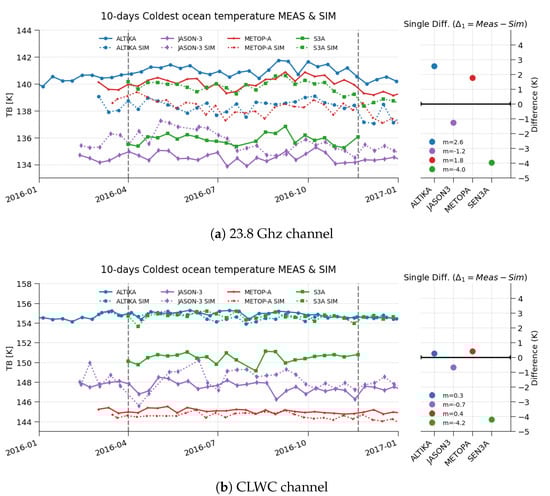 In a study on the detection of MWR calibration drifts, Ruf [5] demonstrated that the coldest ocean temperatures can be observed under low wind, cloud free and low humidity conditions. These points can be used to detect instrumental drifts. This method has also been used for long-term monitoring and inter-calibration [6,7,8]. In this study, we used the same method as for AltiKa [4], i.e., the method described by Eymard [8] derived from Ruf [5]. The coldest ocean points statistical selection can also be applied to simulated brightness temperatures as shown by Kroodsma [7].