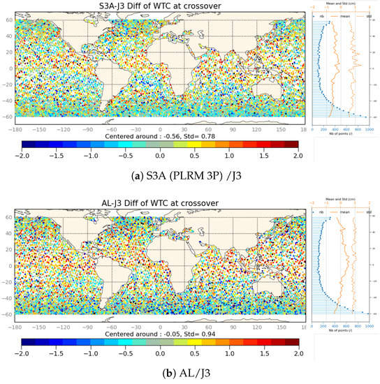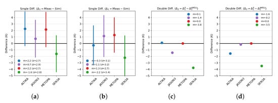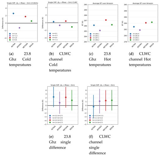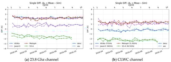Moreover, the single and double difference approach will be used. The analysis is performed by (1) computing single difference for each instrument i ( with i = AltiKa, Jason-3, MetOp-A or S3A) and (2) computing double difference by choosing a mission as a reference and making the difference of the single differences ( with j=AltiKa, Jason-3 or S3A). As said in previous section, the single difference allows to remove the impact of the instrument configurations and the geophysics. Consequently, the double difference allows the assessment of the calibration difference between radiometers with respect to a chosen reference. The results obtained for AltiKa, Jason-3, MetOp-A and S3A over the first year of S3A mission are shown in Figure 5. We do not show here the time series of these differences, but the mean values over the period covered by the study (March to November 2016). Figure 6a,b provide the mean single difference for the four missions and the standard deviation. The single difference for the first channel of AltiKa, MetOp-A and J3 clusters above zero: 2.2K, 2.2K and 0.7K respectively, while S3A is further, around −1.6K. The standard deviation is similar for the four missions, around 2.8K. The CLWC channels of the four missions have different frequencies, that will be compensated by the single difference. Their mean values are close to 1K for Jason-3 and MetOp-A, close to 0K for AltiKa, and lower for S3A at to −1.6K. Standard deviations are slightly larger than 3K for AltiKa, Jason-3 and S3A, and smaller for Metop-A at 2.7 K. Although the respective biases are smaller than the standard deviations, the difference between S3A and the other missions is significant enough to indicate a need for calibration. This is clearly demonstrated by the double difference, shown in Figure 6c,d, where MetOp-A is chosen as the reference mission.