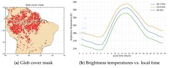 (a) Glob cover mask and (b) variation of Jason-2 brightness temperatures measurements averaged in one hour bins of local time.