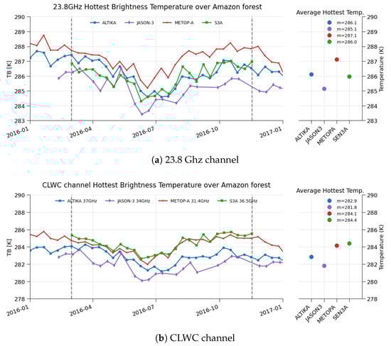 Time series of hottest brightness temperatures over Amazon forest at 23.8 GHz (a) and CLWC channel (b) for AltiKa, Jason-3, MetOp-A and Sentinel-3A. The right panels are showing the average temperature computed over the period defined by the two vertical dotted lines.