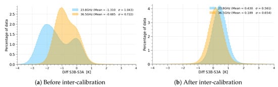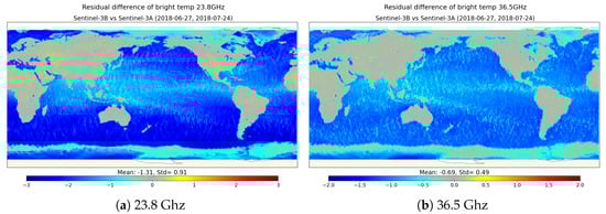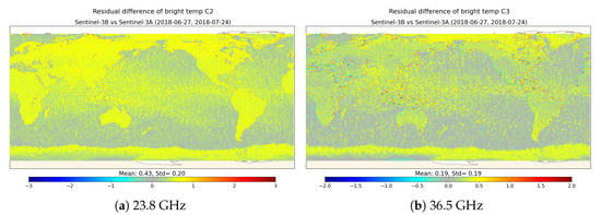 As explained in Section 3.3.2, ECMWF analyses and a Radiative Transfer Model (here UCL) are used to compute co-located simulated brightness temperatures for each mission. Four analyses per day are used, within a latitude band between to avoid ice. A space/time threshold of 50 km and 30 min is used for the co-location. To improve the consistency of the comparison, the outliers are filtered out. Indeed, large differences between measurements and simulations can be observed close to the coast due to the land contamination of the measurements or due to cloudy situations that are inaccurately handled by numerical meteorological models. For both channels of S3A, we will select data farther than 50 km from the coast, with a difference between measured and simulated brightness temperatures smaller than 20 K for both channels, and differences in cloud liquid water content lower than 0.01 kg.m−2.