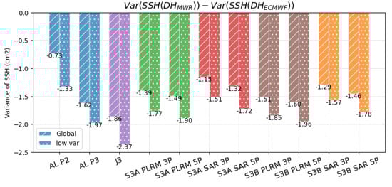 Difference of variance of SSH at crossover points for AL, J3, S3A, S3B for global and low oceanic variability selections.