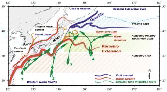 The study area, showing the western North Pacific (18–50° N and 120–180° E). The major currents and migration routes of skipjack tuna (redrawn after [29]).