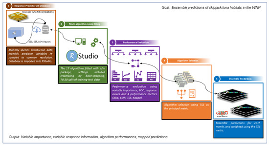 For marine applications, the importance of multi-algorithm models in pelagic species habitat predictions has been shown in conservation planning [17], assessing the impacts of climate change [18], invasive species distributions [19], exploring the functional relationships between the marine organisms and their environment [20,21], and fishery forecasting [7,9]. The application of multi-algorithm and ensemble models for fishery hotspot studies in squids [22], tunas [23], whale sharks [24], and marine biodiversity [18] has shown that ensemble models provide more robust habitat information. The performances of the individual algorithms contributing to the ensembles can be evaluated, which helps in optimization of the ensemble model [25], in addition to the ability to vary individual algorithm parameterization settings. Some of the important factors shaping recent applications of ensemble modeling in marine habitat studies include: (i) increased number of user friendly open-source modelling platforms which diversifies choice; (ii) implementation of multiple algorithms in open-source packages which were previously only operable as single algorithm packages; (iii) implementation of comprehensive functionalities for model performance evaluation using a wide range of metrics; (iv) inclusion of functions to create ensemble predictions; and (v) availability of a variety of geo-referenced marine species distribution datasets as response variables, satellite datasets for use as input predictor variables of current conditions, and predicted climate datasets which represent future conditions [26,27]. From this background, we found it feasible to apply a multi-algorithm modelling approach to derive skipjack tuna habitats in the western North Pacific, where to the best of our knowledge such an approach has not been employed for skipjack tuna with the number of algorithms we have used. Our choice of the sdm package was informed by its ability to execute a suite of 17 algorithms using RStudio, and allow for substantial flexibility in evaluation of model performance, predictions and generation of ensemble models [9,15].