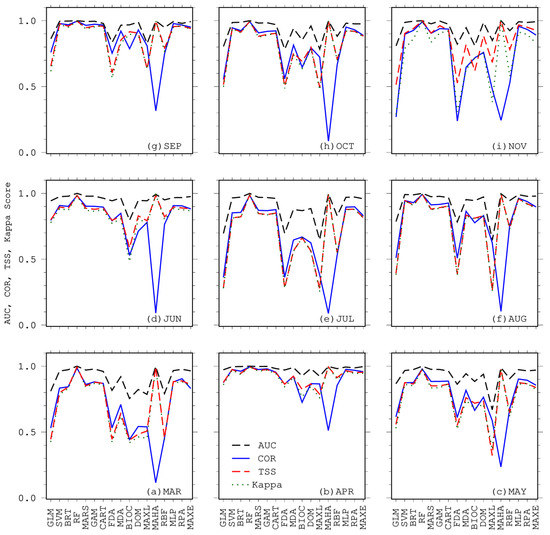 Averaged performance statistics (area under the curve (AUC), correlation coefficient (COR), true skill statistic (TSS), and Cohen’s kappa (Kappa)) for 10 runs from 17 presence-only algorithms, March to November.
