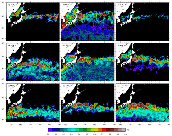 Our averaged model performance results for the monthly models for March to November, constructed using 17 algorithms are shown in Figure 3, in which the AUC, COR, TSS and Kappa statistics for many of the algorithms indicate good model performance. The Support Vector Machine (SVM), Boosted Regression Trees (BRT), Random Forests (RF), Multivariate Adaptive Regression Splines (MARS), Generalized Additive Models (GAM), Classification and Regression Trees (CART), Multi-layer Perceptron (MLP), Recursive Partitioning and Regression Trees (RPART), and Maximum Entropy (MAXENT) algorithms showed high performance consistently in all 9 months. However, the Flexible Discriminant Analysis (FDA), Mixture Discriminant Analysis (MDA), Bioclim (BIOC), Domain (DOM), Maxlike (MAXL), Mahalanobis Distance (MAHA) and Radial Basis Function (RBF) algorithms exhibited low model performance in some of the months, especially when the COR and Kappa metrics are considered (e.g., Figure 3d–f and 3h–i). The AUC statistic also shows high model performance for all algorithms from March to November. The mean and standard deviations of the four performance metrics for all algorithms are shown in Table S1, and the TSS values are in bold print. The mean ROC plots for the 17 algorithms in each of the 9 monthly models are shown in Figure S1, with confidence limits within 2 standard deviations of the mean. The ROC plots are probability plots of sensitivity (true positive rate) against 1-specificity (false positive rate) where an algorithm which presents a curve closer to the top-left corner indicates better performance compared to one where the curve is closer to the 45-degree line of the ROC space. For instance, the July ROC plots generated with the generalized linear model (GLM), FDA and MAXL (Figure S1:(5,68,104)) algorithms indicate ROC plots whose part of the plot lean towards the 45-degree line, hence lower performance. These results are quite different from the MAXENT ROC plots (Figure S1:(145–153)) for all the months, which illustrate higher performance. The variable response curves for SSC, SSHA and SST are shown in Figures S2, S3 and S4 respectively, where the values which influenced model performances are indicated by the peaks of each curve in a specific algorithm. However, there are algorithms which show relatively monotonic shapes for certain variables, e.g., the BRT and MAXL for the SSC, SSHA and SST variables. The shape, peak, and range of values around the peak present important information which influences the HSI map. Figure S5 illustrates the contribution of each variable in the respective model. These results illustrate the relative importance of each of the 3 variables used to construct the model, hence variables with high values on a plot indicate a relatively higher contribution by that variable to the model fit and HSI map, and vice-versa. Notable, for instance, is the importance of SSHA in the GLM, SVM, MLP and RPART algorithms between April and June, while SST shows a strong variable contribution in MAHA, MAXENT, MAXL, and BIOC between September and November. The ensemble HSI maps for March to November period are shown in Figure 4, which illustrates the aggregated map. The high value pixels (HSI>0.7) show a consistent pattern where the latitudinal displacement increases northward from March toward October and November.
