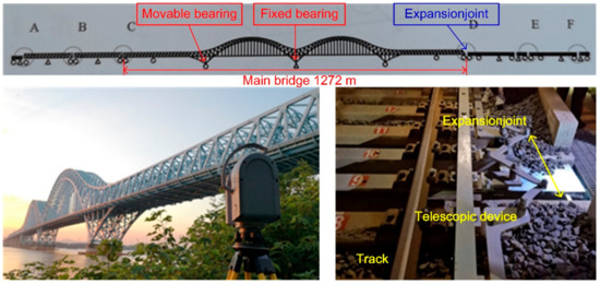 Fixed and movable bearings were mounted on piers to support the bridge and adapt to the displacement difference between each sections. Telescopic devices were installed at each expansion joint. Due to the large longitudinal displacements at both sides of the main bridge, eight SA60-1200B telescopic devices, with displacement adaption of +/−400 mm, were installed at four high-speed railway tracks in the two sides, see Figure 2.