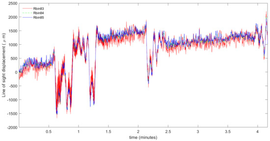 Two measurements of the same section of the bridge with perpendicular LOS (view S2b and view S3) were performed in order to emulate the measurement of a two-RAR system. Although the two measurements were not simultaneous, we compared measurements with similar loads on the bridge. The loading cases of 16 carriages high-speed trains passing on the bridge (track ③, N2S) were chosen. Due to the fact that the train-induced lateral displacements are within 0.1 mm (see Figure 8a), Figure 19 depicts the converted displacement in the vertical direction. In Figure 19a, the three radar bins (number 26, 27 28) have exactly the same displacement behavior, while the magnitudes of vibration are different. This is because the bins have different distances from the pier 1#0: the farer the distance, the larger the magnitude. In Figure 16b, the displacements have a similar behavior of that shown in Figure 16a. The largest displacements are related to the part of the eccentric train loading of the bridge: the farer to the eccentric loading, the smaller the displacement.