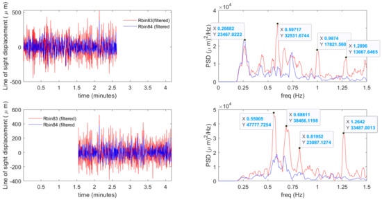 Filtered LOS displacement time histories of bin83 and bin84 with corresponding periodograms spectra calculated for two sub-samples with a partial overlap.
