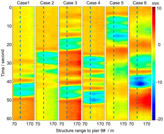Vertical temporal displacement maps of the 192-m span for the analyzed six cases. X axis (70 m~170 m) shows the distance to pier #9; dashed lines indicate the middle of the 192-m span.
