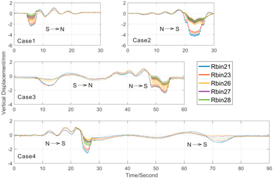 Figure 15 shows the vertical displacement time histories of the radar bin 21, 23, 26, 27 and 28. The displacement histories include two parts: the first part is mainly caused by the loading of passing train and the second one is its aftershock. The shape of the displacement history is related to the direction of passing train, which has the same characteristics as those at view S2a. The duration of the first part depends on the length of the train and its speed: it takes approximately three seconds for a train with 8 carriages and six seconds for a train with 16 carriages. This agrees with a carriage length of 25 m. The duration of the second part is more than 15 s for both 8- and 16-carriage trains. The maximum vertical displacement of the second part is less than 1 mm for all the cases, while the 16-carriage train induced larger vertical displacement (4.2 mm) in the first part one respect to the 8-carriage train.
