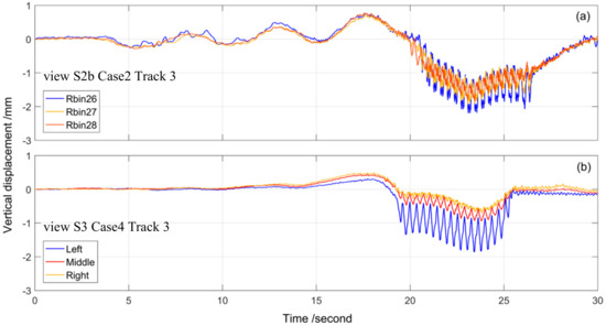 Vertical displacements in (a) view s2b case 2 track 3 and (b) view s3 case 4 track 3. the ‘left’, ’middle’ and ’right’ are the radar bins selected at the corresponding position in the bridge lateral.