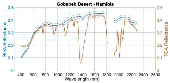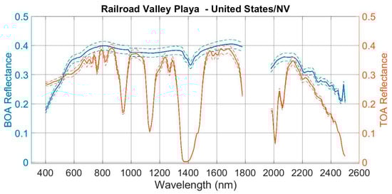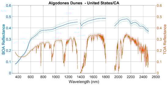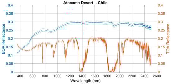 - Pinto, C.T.; Ponzoni, F.J.; Barrientos, C.; Mattar, C.; Artigas, A.S.; Castro, R. Spectral and atmospheric characterization of a site at atacama desert for earth observation sensor calibration. IEEE Geosci. Remote Sens. Lett. 2015, 12, 2227–2231. [Google Scholar] [CrossRef]