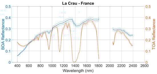 - Meygret, A. RadCalNet site description. In CEOS Reference: QA4EO-WGCV-IVO-CSP-002_LC. Name of site: La Crau; Centre National d’Études Spatiales (CNES), Physics for Optical Measurement Service: Toulouse, France, 2018; 24p. [Google Scholar]