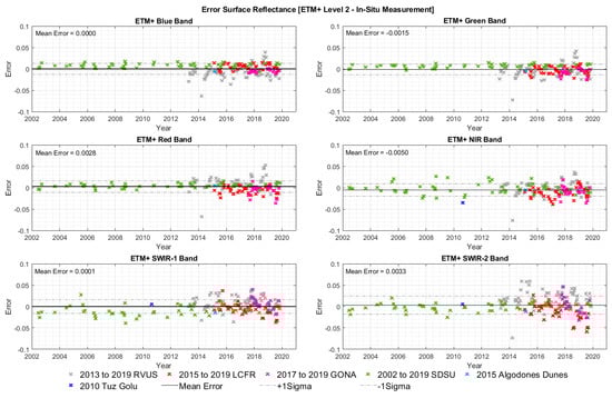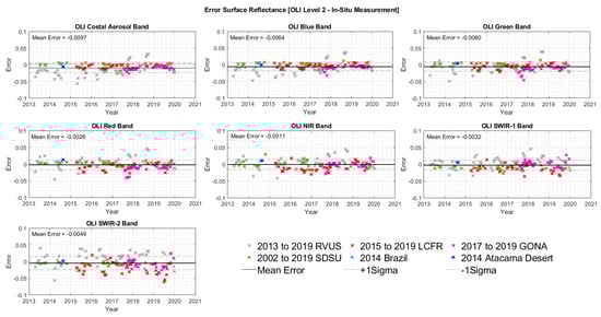 - Jing, X.; Leigh, L.; Pinto, C.T.; Helder, D. Evaluation of RadCalNet output data using Landsat 7, Landsat 8, Sentinel 2A, and Sentinel 2B Sensors. Remote Sens. 2019, 11, 541. [Google Scholar] [CrossRef]