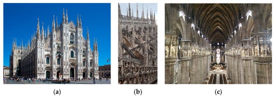 (a) Milan Cathedral main facade. (b) A detail of the complex roof with repetitive buttresses. (c) Internal view of the main nave and its capitals.