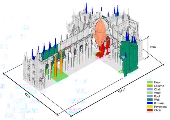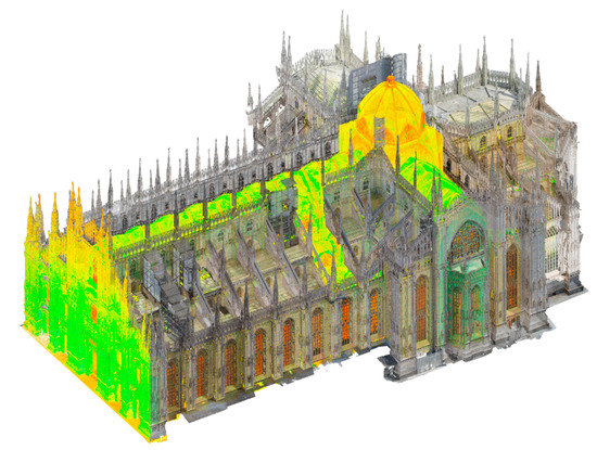 To support the exceptional maintenance activities, a number of focussed survey operations were conducted in the last 10 years, producing 3D data and 2D classical representation at a 1:50 scale for the Main Spire, the altars of the transept, and the Dome Cladding [42]. More recently, detailed point clouds of the entire Cathedral at an average and uniform resolution of 5 mm (Figure 2 and Table 1) were produced using Terrestrial Laser Scanning (TLS) for the interior spaces [43], photogrammetry for the exteriors [44] and integrating both techniques in narrow service spaces [45,46].
