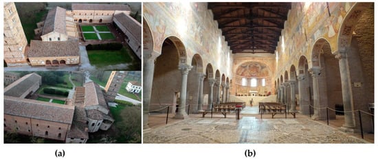 The IX century Benedictine monastery of Santa Maria di Pomposa is situated in the province of Ferrara and represents one of the most important Abbeys of Northern Italy. The main building of the complex is the Basilica, consecrated in 1026 AD, that presents a layout that recalls the typical Ravenna style, in which the inner space is subdivided into three naves through continuous colonnades, bounded with relative pulvini (Figure 3). The central nave ends with a hemispherical apse that corresponds to an outer pentagonal shape. The actual framework is the result of different significant transformations occurred through the centuries, and that have basically changed the original Roman aspect [47,48]. Several survey campaigns have been conducted in the past [49,50] in order to analyse and monitor the structural behaviour, preserving the Abbey from possible damages. These inspections verified that the massive bell tower caused distortions of the church. In order to reduce this structural problem, a sequence of walls was added in the side aisles [51,52]. The actual church frame represents a non-regular case study from the geometric point of view, including columns inserted in transverse masonries, irregular structural walls and roof elements, and roto-translation of single beams.