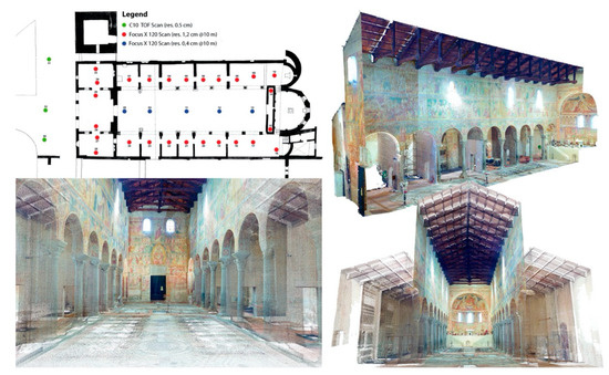 A 3D survey campaign of the Abbey was conducted to acquire the global structure of the church and its annexed buildings. The survey project was an opportunity to test different approaches and technologies, aiming at finding the best solution for the high-resolution documentation of a big architectonic complex [53]. The survey campaign included both image- and range-based techniques.